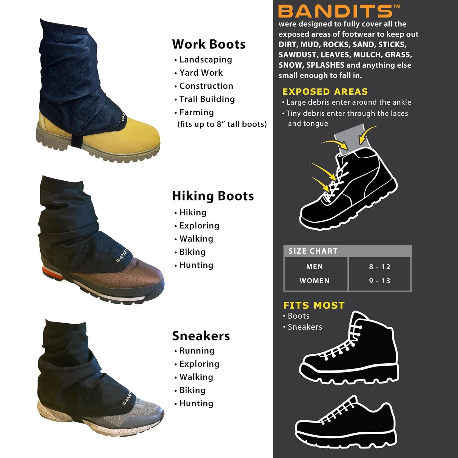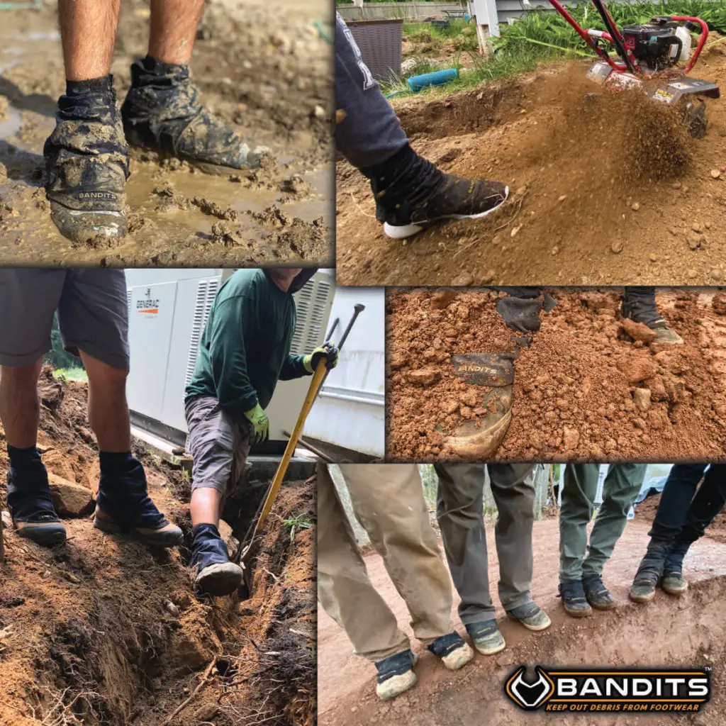 These have been working great all summer. The Bandits let me work comfortably in shorts and sneakers when moving dirt and doing yard work. No more shoes full of pebbles and debris. Plus my shoes are lasting longer without all the grit grinding into the shoelaces and tongue.